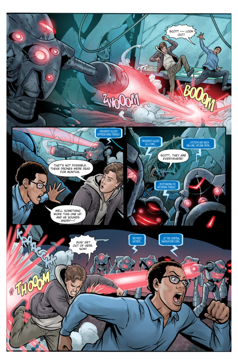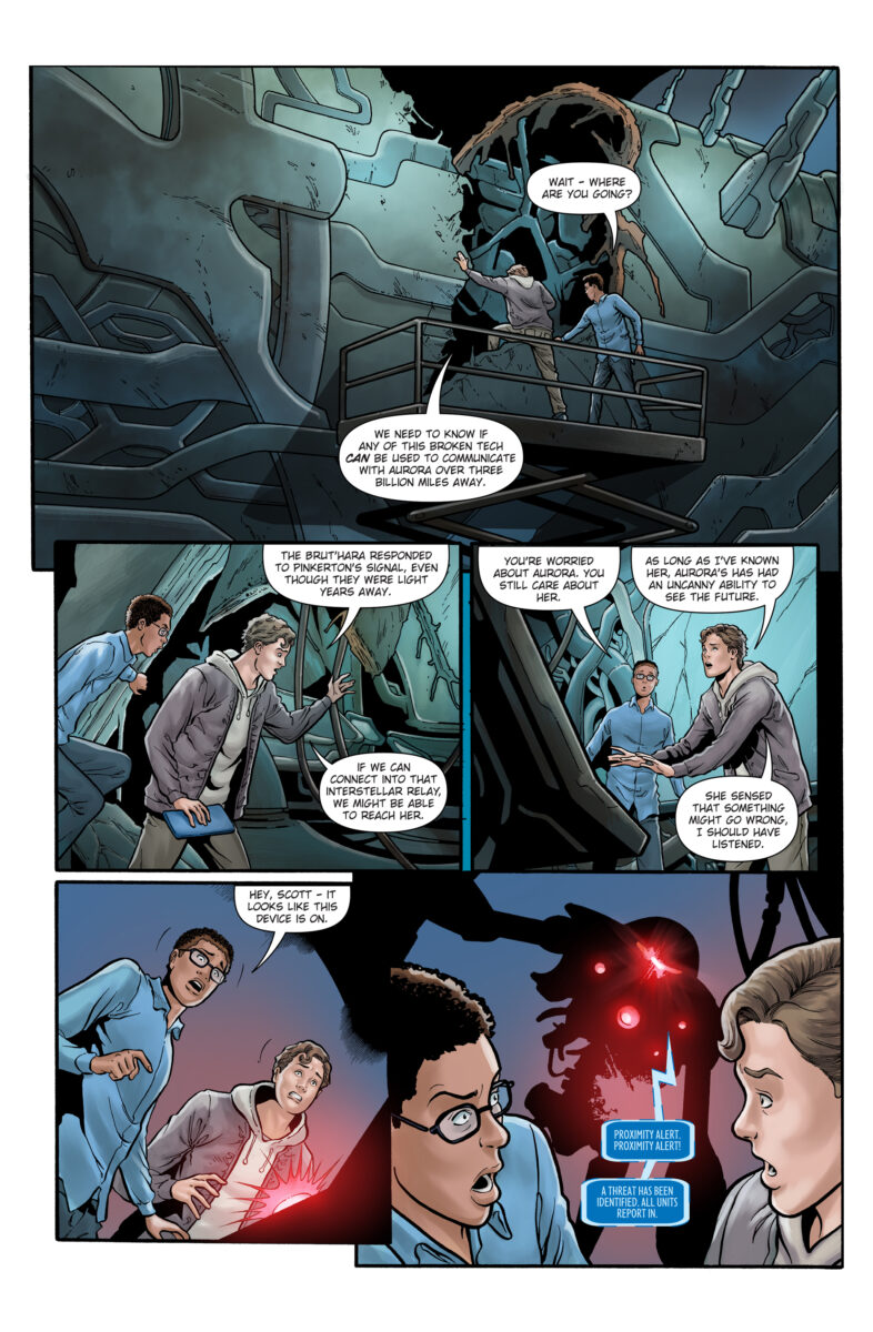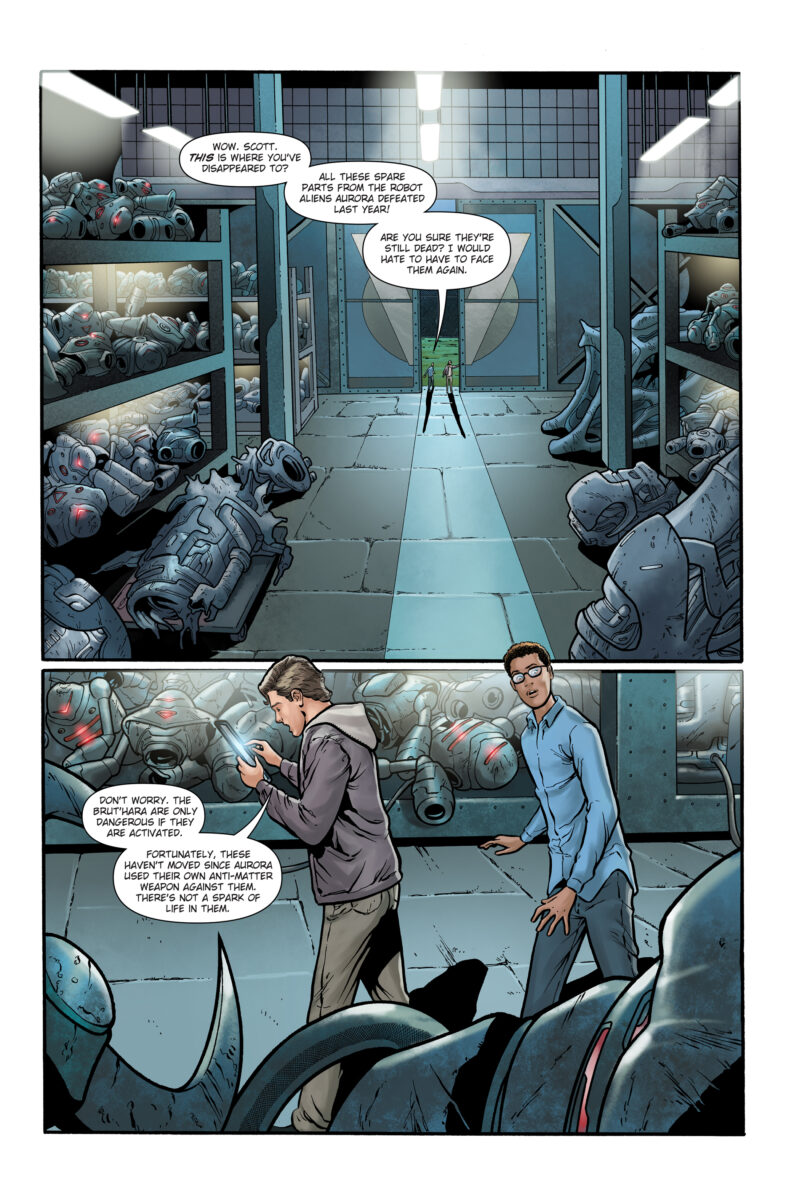 Part Two of a four-part series! Earth’s alien-born heroine Aurora Palmer has disappeared during her mission to explore a mysterious object on a collision course with Earth. Back on Earth, Scott studies the broken remnants of the Brut’hara, looking for a way to communicate with Aurora. Meanwhile, Kristine and Gus watch helplessly from Vanguard, unaware that Aurora is alive and exploring with old friends the massive interior of the ancient structure.